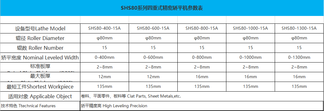 SHS80系列四重式高精密矯平機(jī)是通過整平機(jī)多組滾筒滾壓式矯平,從而達(dá)到平整效果。四/六重式高精密整平機(jī)采用上、下排矯平工作輥與支撐軸承(輪)之間加裝支撐輥,構(gòu)成上下各二/三重共四/六重的組輥結(jié)構(gòu);矯平輥受力分布均勻,結(jié)構(gòu)剛性好,工作輥撓曲變形小,矯平精度高,行程諧波衰減性矯直,從根本上解決普通矯平常見的矯不平、易產(chǎn)生輥印壓痕、工件塌角、鐮刀彎等問題,提高板材的矯正精度,適用范圍廣,材料表面不會(huì)留下輥壓痕跡,矯正精度高。